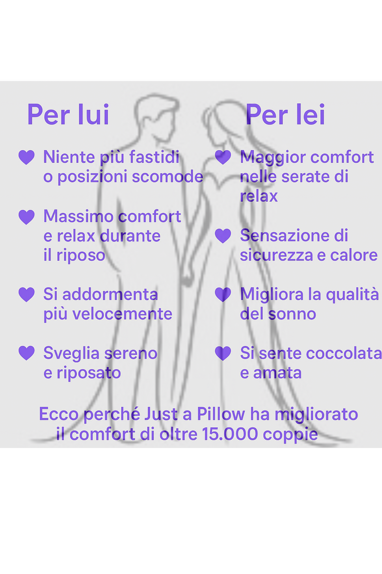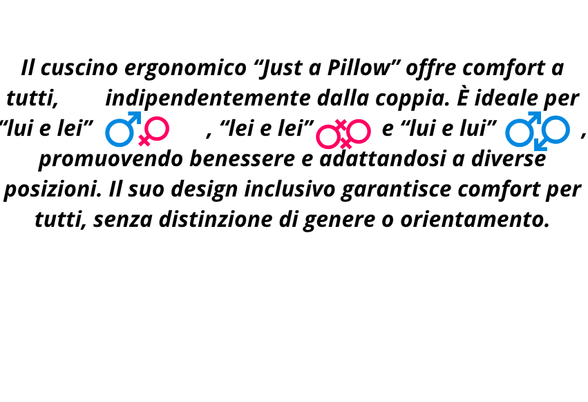 Il cuscino ergonomico “Just a Pillow” offre comfort a tutti, indipendentemente dalla coppia. È ideale per “lui e lei” , “lei e lei” e “lui e lui” , promuovendo benessere e adattandosi a diverse posizioni. Il suo design inclusivo garantisce comfort per tutti, senza distinzione di genere o orientamento.